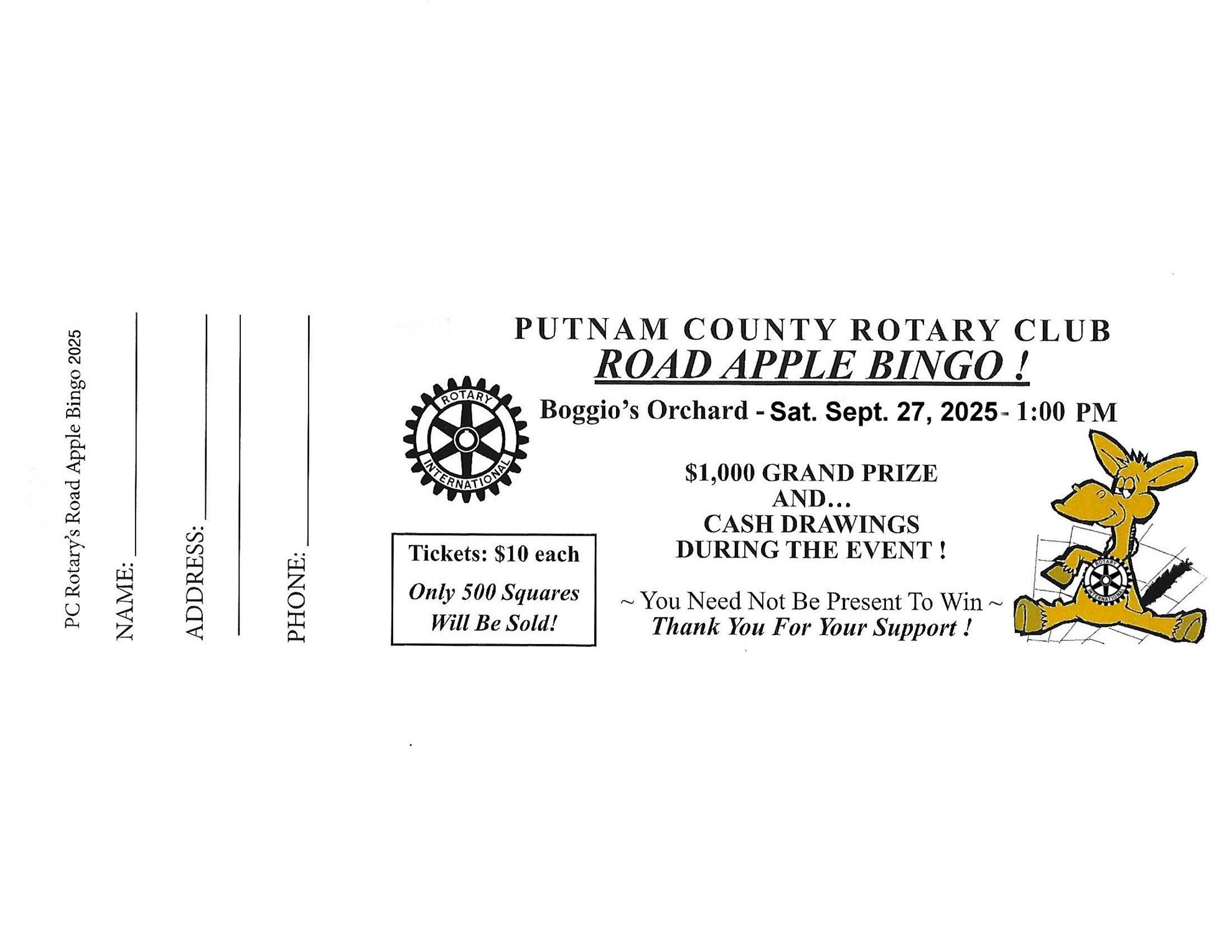 It's not often that you can turn a pony's "road apple" into $1,000 -- but this is that chance! On Saturday, September 27, Putnam County Rotary will host its annual Road Apple Bingo event at Boggio Apple Ordhard's fall festival and craft fair, walking a pony up, down and across a grid of 500 squares painted on the turf, until she decides where to land her $1,000 "road apple! "